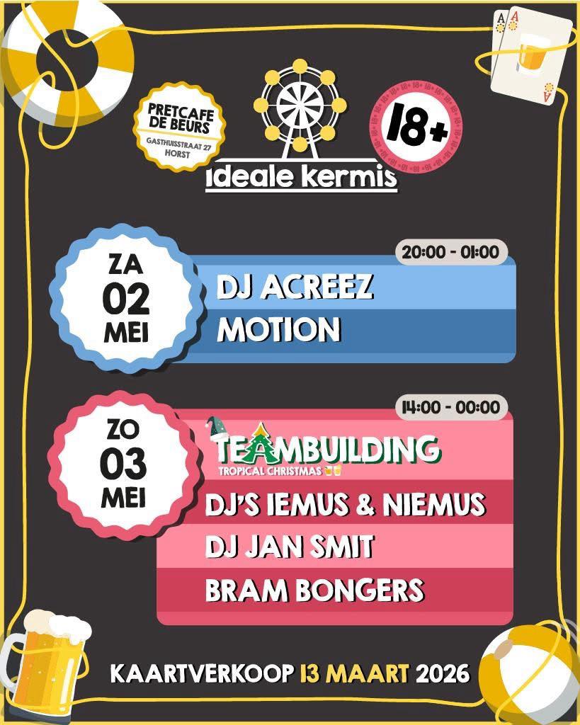 Artiesten IDEALE KERMIS 2026 Bekend!! 🎉 De artiesten zijn bekend! De Ideale Kermis belooft 2, 3 en 4 mei weer drie dagen vol muziek en gezelligheid te worden. 🎤🍻 Met m.m.v. Dj Acreez, Motion, Dj's Iemus & Niemus, Dj Jan Smit, Bram Bongers, Pigtail, The Mudroad Rangers, P.P.M., We Two en William Smulders. Zondagmorgen is […]